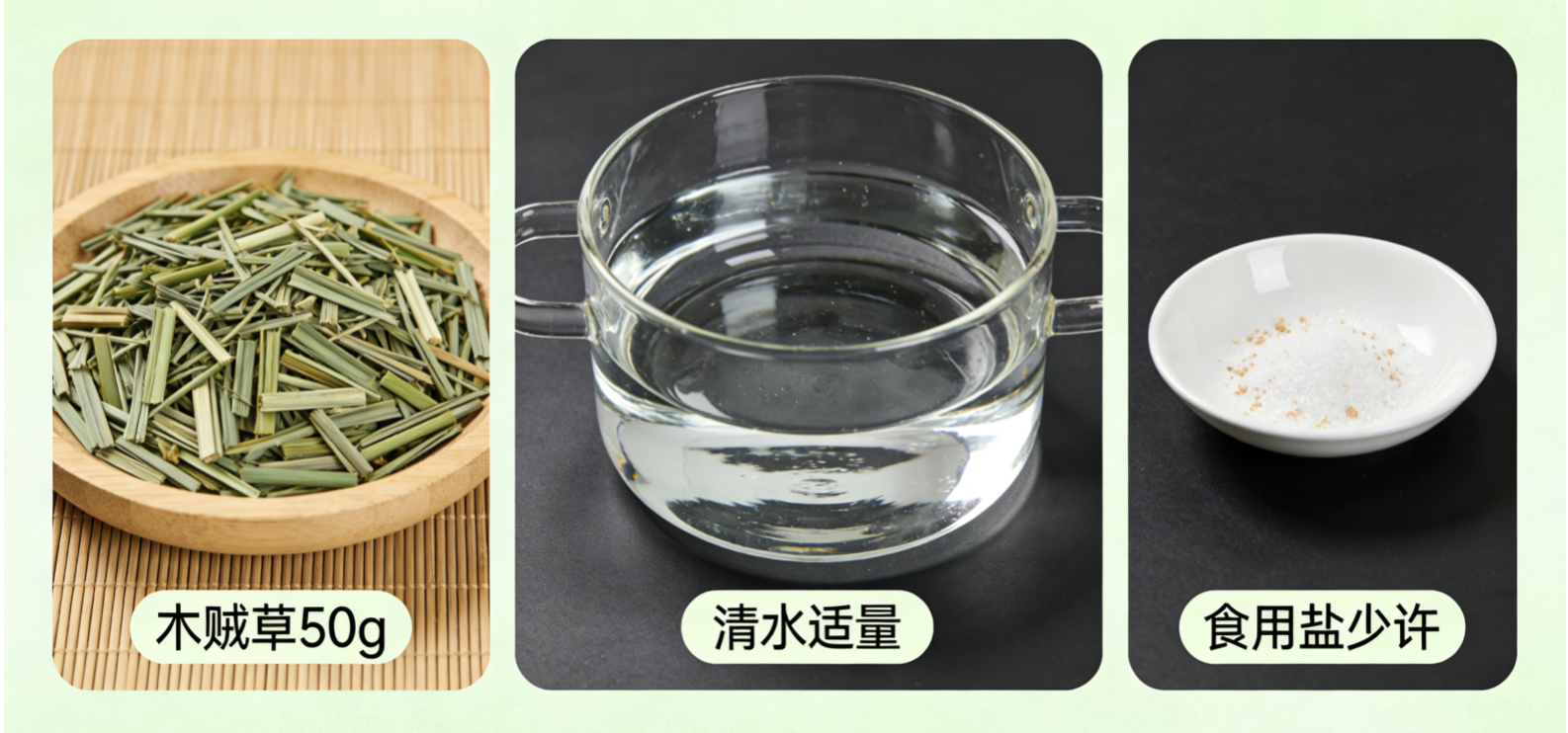 准备材料:木贼草50g(用量要足,才能保证作用,建议去正规药店购买,品质更有保障)、清水适量、食用盐少许(一点点即可,不用多)。