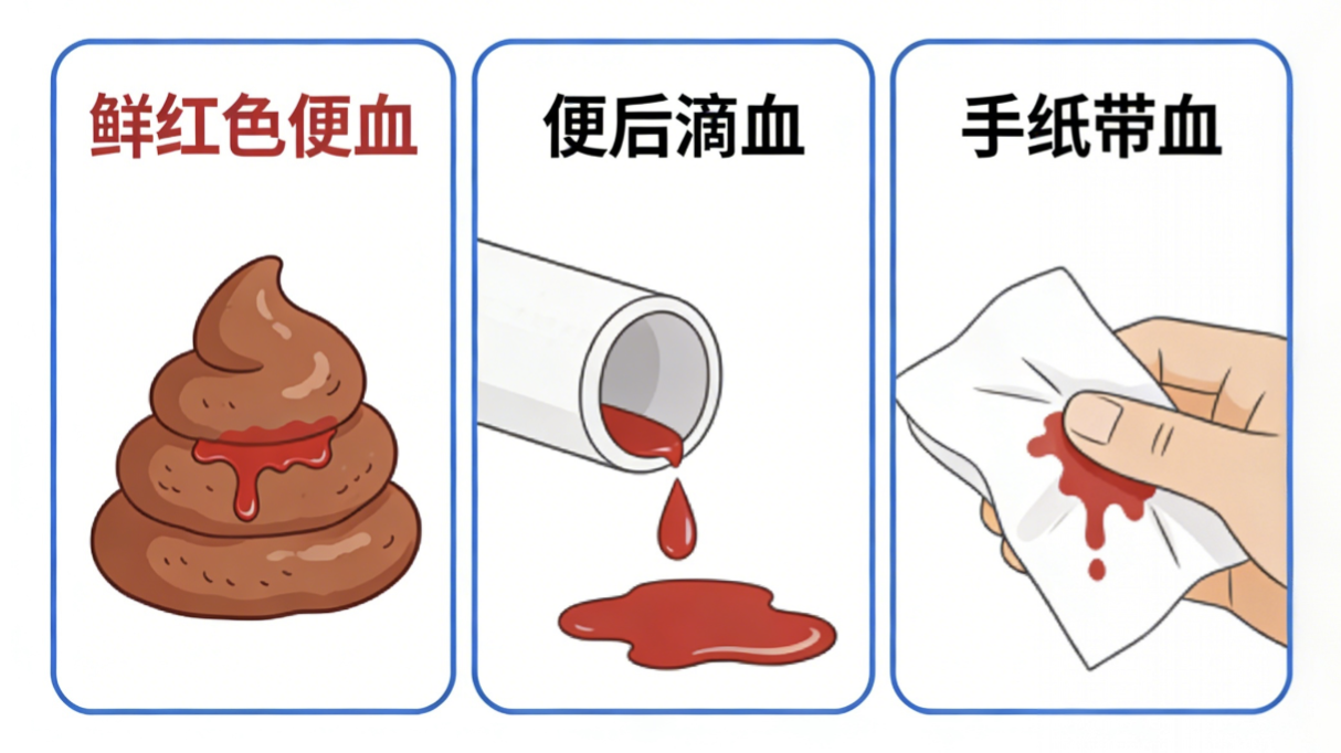 结直肠癌便血:大多是暗红色,和大便混合在一起,呈“果酱样”或“黏液血便”,常伴随腹痛、腹胀、排便习惯改变,比如大便变细、变扁。