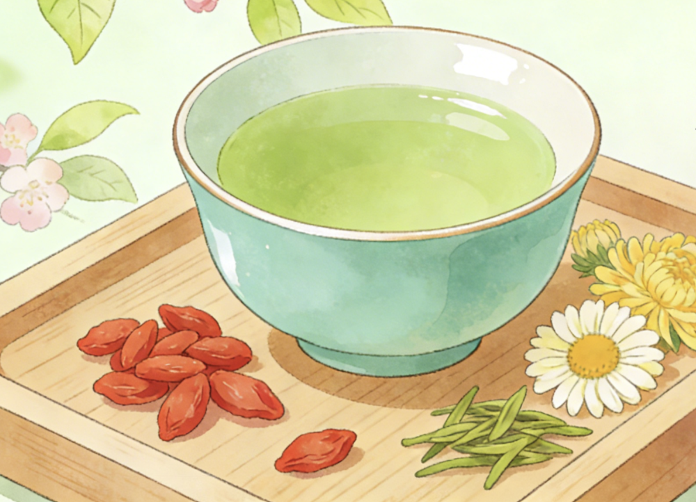 枸杞能滋补肝肾、益精明目,补充少量营养;菊花性微寒,能清肝明目、疏散风热,两者搭配,中和了菊花的微寒,变得温和无刺激,口感清淡,不会给身体带来负担。