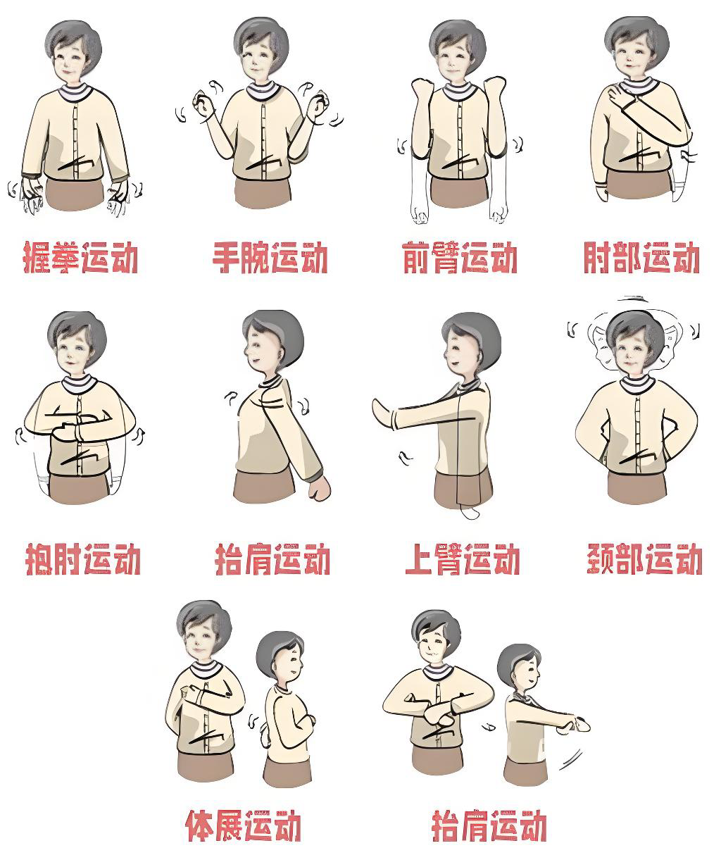 ②坐起后开始做屈肘、前臂伸屈锻炼,试用健侧手握住患肢的大拇指,帮助患肢做上举动作。